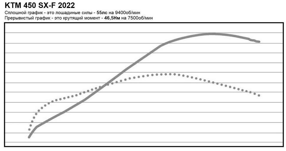Нынешнее поколение топовой кроссовой модели KTM 450 SX-F выпускалось с 2019 по 2022 модельные годы, и одной из главных причин его популярности был отличный двигатель. Большой одноцилиндровый мотор с одним верхним распредвалом и степенью сжатия 12,75:1 имеет длинную и достаточно ровную характеристику тяги и максимальные среди одноклассников пики выходной мощности и крутящего момента. На диностенде KTM 450 SX-F 2022 года выдаёт 55,0лс на 9400об/мин и 46,5Нм на 7500об/мин. Превзойдёт ли 450 SX-F 2023 года эти цифры? Пока неизвестно, но об этом можно узнать, если на тот же диностенд поместить 450 SX-F Factory Edition 2022 года.