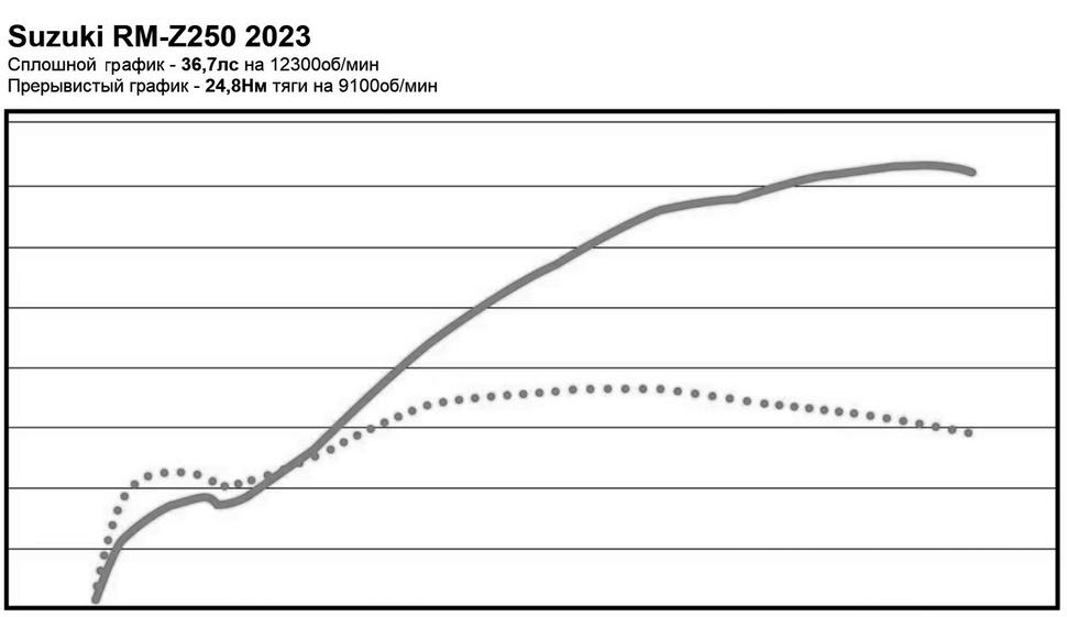 На диностенде четырёхтактный кроссовый 250-кубовый мотоцикл Suzuki RM-Z250 2023 модельного года, заднее колесо которого было обуто в асфальтовую шину, выдал пиковые 36,7лс на 12300об/мин и 24,8Нм тяги на 9100об/мин. (для сравнения мощность модели 2021 года можно посомтреть тут)