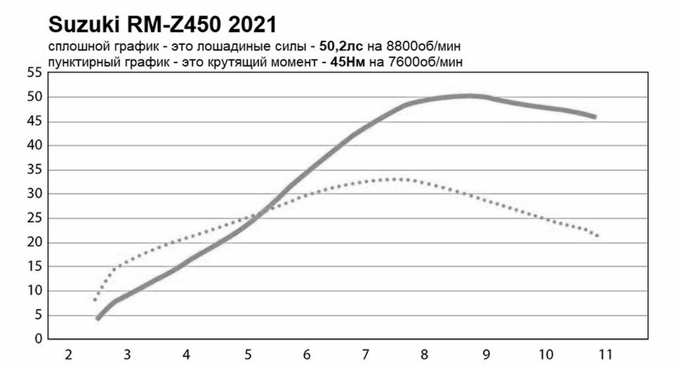На диностенде RM-Z450 2021, заднее колесо которого было обуто в дорожную покрышку, выдал 50,2лс на 8800об/мин и 45Нм на 7600об/мин.