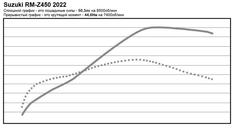 Suzuki RM-Z450 2022 года с только что заменённым воздушным фильтром и обутым в дорожный Dunlop D404 задним колесом выдаёт довольно знакомые цифры - 50,3лс на 8500об/мин и 44,6Нм на 7400об/мин.