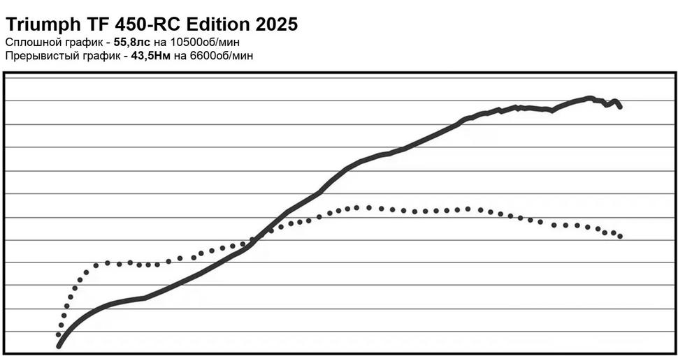 Дальше было несколько тестовых прогонов, лучшие результаты которых составили 55,8лс на 10500об/мин и 43,5Нм на 6600об/мин. Для сравнения, это на 0,5лс больше, чем выдала Yamaha YZ450F (которой принадлежит рекорд 2025 года по мощности среди стандартных 450-кубовых кроссовых моделей) и на 0,8Нм меньше, чем у Husqvarna FC 450 (которая показала антирекорд по крутящему моменту среди тех же стандартных кроссовых моделей 2025 года).
