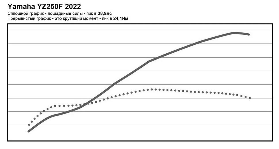 С тех пор, как Yamaha в 2014 году развернула головку цилиндра на своих четырёхтактных кроссовых 250-ках, эти модели славятся отличной тягой на низких и средних оборотах и ощущение обильной тяги. Тем не менее, в цифрах, то есть, на диностенде, YZ250F лидером никогда не была, и модель 2022 года - не исключение.