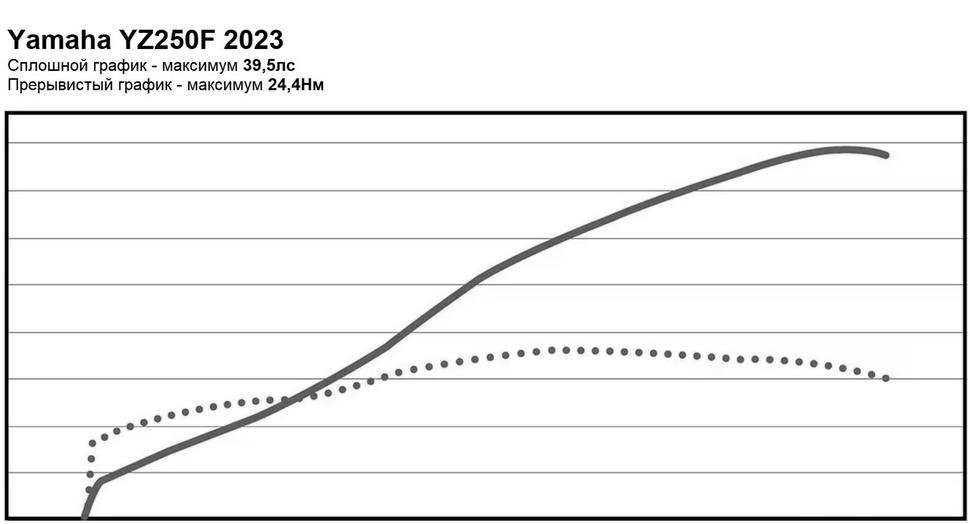 На диностенде Yamaha YZ250F 2023 года произвела 39,5лс и 24,4Нм тяги. При этом пиковая тяга приходится на средние обороты, а вот максимальная мощность достигается практически рядом с отсечкой. Но независимо от цифр с диностенда Yamaha весьма ценится за её великолепную характеристику мощности: в реальной жизни двигатель YZ250F весьма тяговит, очень быстро и охотно набирает обороты (поэтому приходится часто переключать передачи), и в умелых руках даёт великолепный разгон и отличную управляемость.