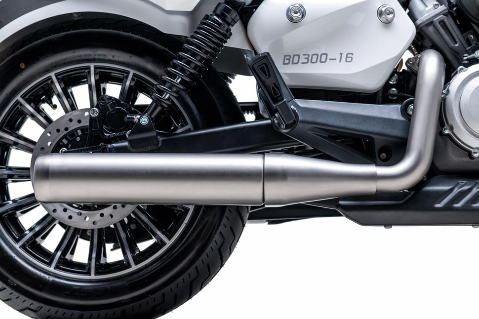 Итак, они относятся к одному классу - круизёрам, но их сложно перепутать даже по силуэту. Если в Chinchilla с её невысоким рулём прослеживается что-то бобберно-динамичное, то Rock 300 явно более вальяжен. Этому способствует и более высокие стойки прямого руля, грипсы которого расположены ближе к райдеру, и длинная (1520мм против 1410мм!) колёсная база, и даже несколько больший вес - 177кг против 168кг Шиншиллы. По-разному выполнена и отделка многих компонентов, причём отличаются они не только цветом, но и формой и механической обработкой. Например, колёсные диски на Benda Rock 300 не просто другого размера (оба колеса диаметром 16 дюймов), но и имеют фрезерованную отделку, а крылья на них более внушительны, чем на Chinchilla 300. Бензобак отличается и формой, и объёмом, сиденье состоит из двух раздельных элементов, отличаются боковые элементы обвеса, и даже о мелочах производитель позаботился, оснастив короб воздушного фильтра шильдиком с названием конкретной модели. Интересным решением на Rock 300 стал двухсторонний нержавеющий выхлоп с брашированной отделкой, удачно перекликающийся с фрезерованными гранями колёсных дисков и окантовками обвеса.