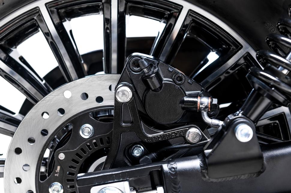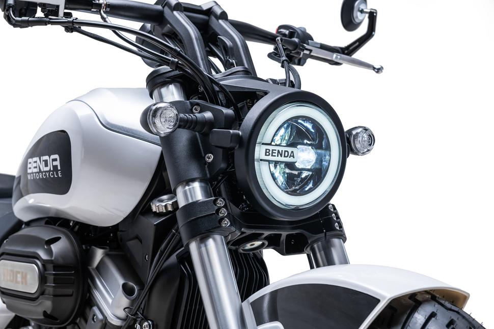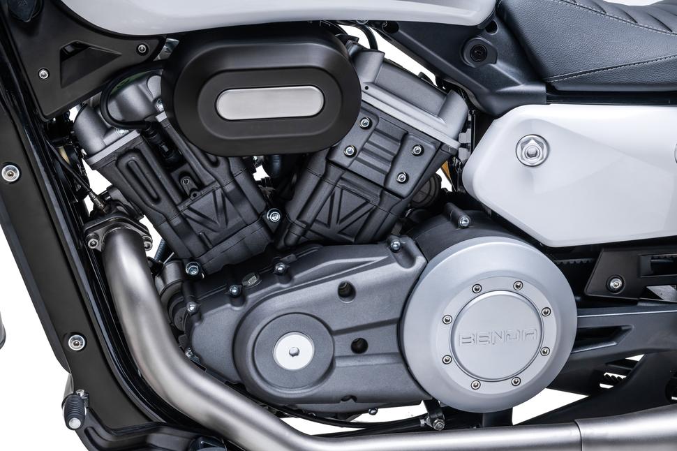 При этом двигатель, если исключить крышку воздушного короба, идентичен на обеих моделях не только по характеристикам, но и по отделке, и одинаково хорошо гармонирует с обоими вариантами дизайна. Серебристые крышки мотора на Benda Rock 300 перекликаются с брашированным и фрезерованным металлом по обе стороны мотоцикла, а металлик вилки и обвеса выгодно разбавляет чернёную отделку остальных компонентов. В приглушённой гамме отделаны и внутренние части тормозных дисков с модуляторами ABS, и конечная передача, и тормозные суппорта. Конструктивно и стилистически двигатель выполнен в духе американских круизёров, и дело тут не только в V-образной компоновке, но и в отделке крышки первичной передачи, стилизованной под типичные американские "праймари".