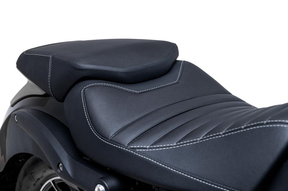 Что касается посадки на Benda Rock 300, то вынесенные вперёд подножки, довольно высокий руль и чашевидное сиденье обуславливают удобное и расслабленное положение тела при езде. Пассажирская часть сиденья выполнена в виде отдельного элемента и сделана более просторной, чем на Chinchilla 300, но лишена поручней, так что при езде вдвоём пассажирке придётся крепко держаться за водителя (что, конечно, плюс). В плане эргономики всё лаконично и со вкусом- прямой и широкий дрэгстерный руль оснащён зеркалами в торцах грипс и имеет много свободного пространства для установки держателя телефона или навигатора. Пульты незагромождённые и симпатичные, без излишеств типа раздельных поворотников, зато имеется аварийная сигнализация. Сцепление имеет тросовый привод, но для 300-кубового класса его обычно вполне достаточно. Газ тоже тросиковый, поэтому на режимы езды или круиз-контроль рассчитывать, увы, пока не приходится. Бензобак довольно широкий и не имеет выемок под колени, но этот мотоцикл не из тех, на которых придётся глубоко свешиваться в повороте.