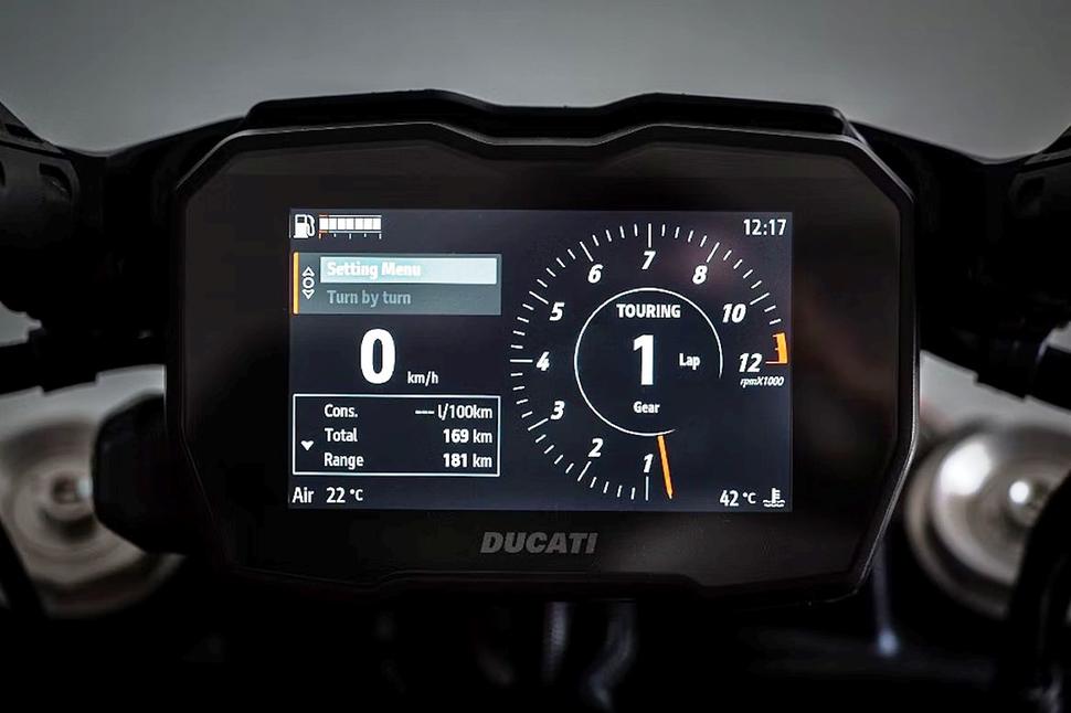 Тычок кнопки запуска - и двигатель мгновенно оживает. Замок зажигания тут беспроводной, так что ключ нужен только для открытия сиденья. Пробный рывок газом - и Ducati Diavel V4 властно рявкает, но быстро успокаивается и возвращается к безмятежным холостым. Другие впускной и выпускной тракт обуславливают отличия в звуке от Multistrada - Diavel звучит более грубо и неприкрыто, хотя по части мотора они практически идентичны. Очень неплохо!