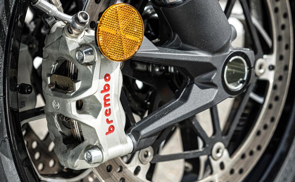 Физическая и визуальная масса Ducati Diavel V4 сосредоточена низко спереди. Широкие воздуховоды обрамляют горбатый бак. Спортивный плуг выглядывает из-под брюха этого зверя. Спереди новая фара с характерными скобками ДХО хмурится из-под аккуратного обтекателя. Руль на кованой проставке оснащён пятидюймовой TFT-приборной панелью, пультами с подсветкой, зеркалами и поворотниками в торцах грипс. Высота и изгиб руля обеспечивают комфортную посадку и хорошую управляемость. Массивные 50-миллиметровые перья вилки держат симпатичное переднее колесо, но его 10-лучевой дизайн сложно разглядеть за гигантскими 330-миллиметровыми тормозными дисками с суппортами Brembo Stylema на них. Машинки тормоза и гидравлического сцепления - тоже от Brembo.