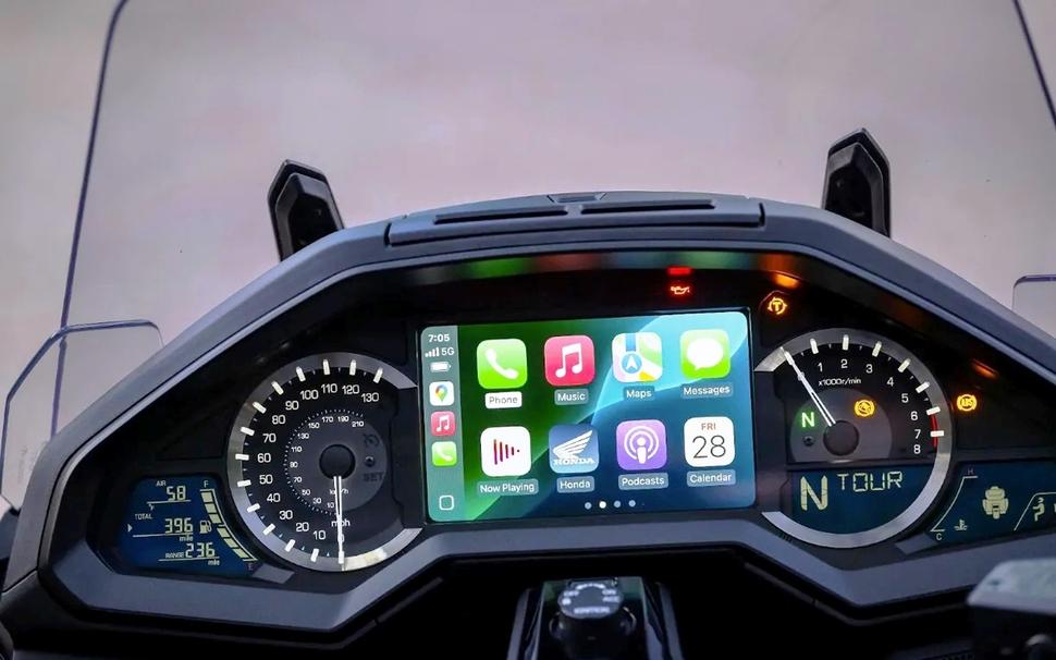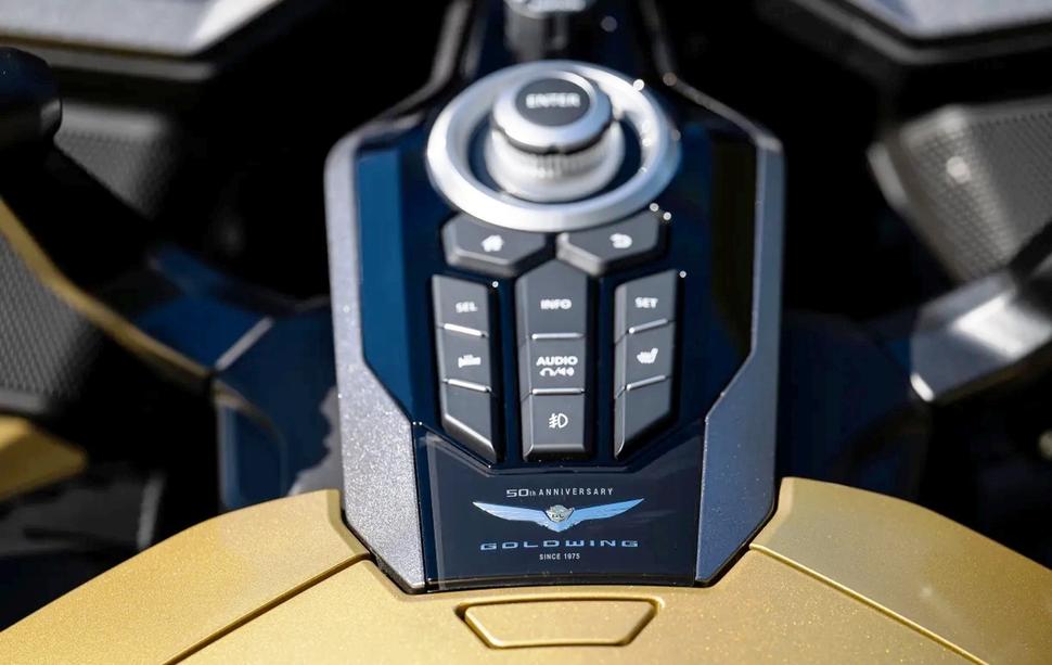 Увы, но на свой 50-й юбилей Gold Wing не получила ничего, кроме новой корпоративной футболки. В том смысле, что юбилейная Голда 2025 года по технической части ничем не отличается от прошлой. Верней, так: она получила новую расцветку и юбилейные шильдики, зато лишилась фирменной Голдовской навигации в пользу Apple CarPlay и Android Auto.