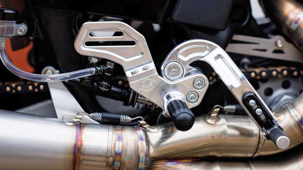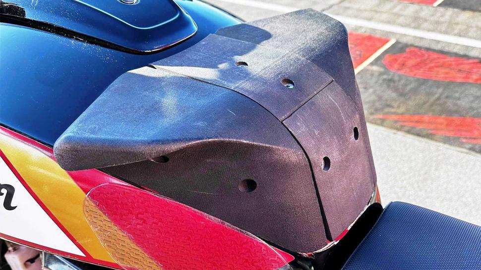 Этот аксессуар в форме наковальни не только обеспечивает опорные точки для колена при свешивании, но и предотвращает соскальзывание вверх по баку на резких торможениях. Этот чудовищный горб, напечатанный на 3D-принтере и не видевший даже банальной наждачной бумаги, оказался настоящим спасательным кругом, дающим тактильную уверенность и чёткость посадки тем, кто никогда ещё не ездил на чём-то настолько массивном и в то же время высоком. Не поймите неправильно - гоночных бэггеров в природе существует множество, но вот именно этот мастодонт - это совершенно новый опыт.