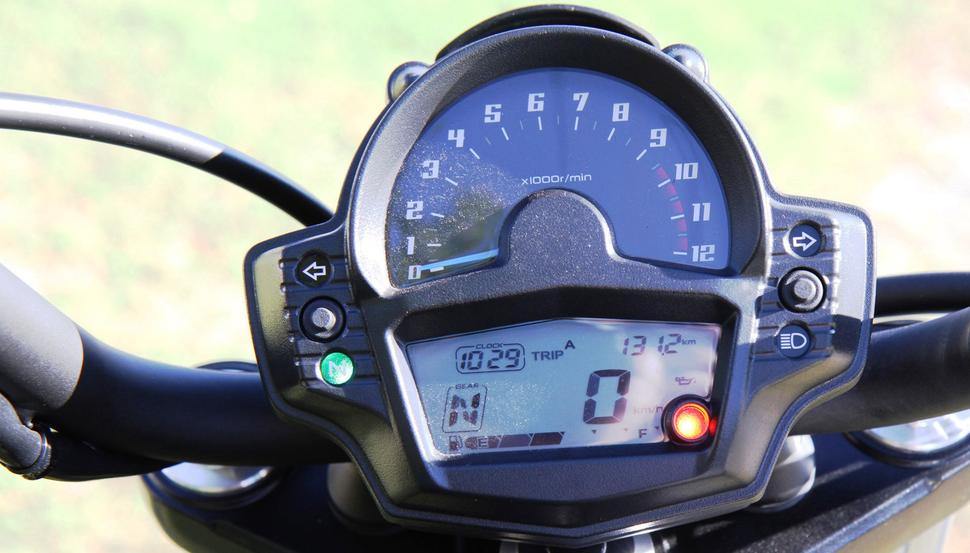 Приборная панель простая и эффективная, но за такой ценник не повредила бы более современная TFT-приборка. Здесь же стоит аналоговый тахометр и цифровой ЖК-дисплей со спидометром, шкалой уровня топлива, трипметром и индикаторными лампочками. Не самая технологичная, но понятная и удобная. Самое то для тех, кому ехать, а не пялиться в приборку с кучей подменюшек.