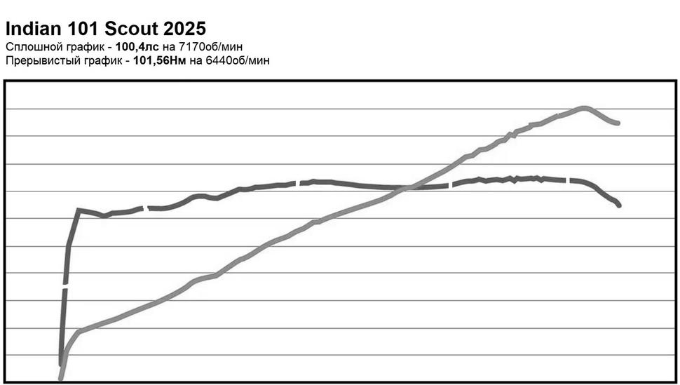 На весах Indian 101 Scout 2025 года с полным баком показал 250,4кг. А на диностенде он выдал 100,4лс на 7170об/мин и 101,56Нм тяги на 6440об/мин с колеса. Для сравнения, Harley Davidson Sportster S 2023 года выдал 109,6лс на 7530об/мин и 115,5Нм на 6000об/мин. И хотя 101 Scout проигрывает своему прямому конкуренту по мощности и тяге, ровная полка момента и линейная характеристика мощности делают его двигатель невероятно эластичным и управляемым на любых оборотах. Да и на 100лс с колеса жаловаться грех, хоть, конечно, соперник от HD несколько порезвее.