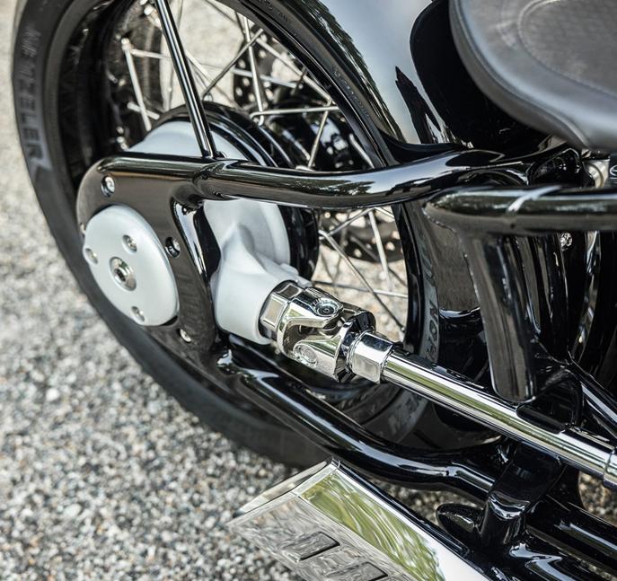 Очередной визуальный акцент BMW Motorrad Concept R18 - открытый хромированный кардан, соединяющий заднее колесо с двигателем. Очень симпатично у них получилось открыть все элементы байка, показывая всю механику. А электроника тут была упрощена до минимума: стартер и светотехника.