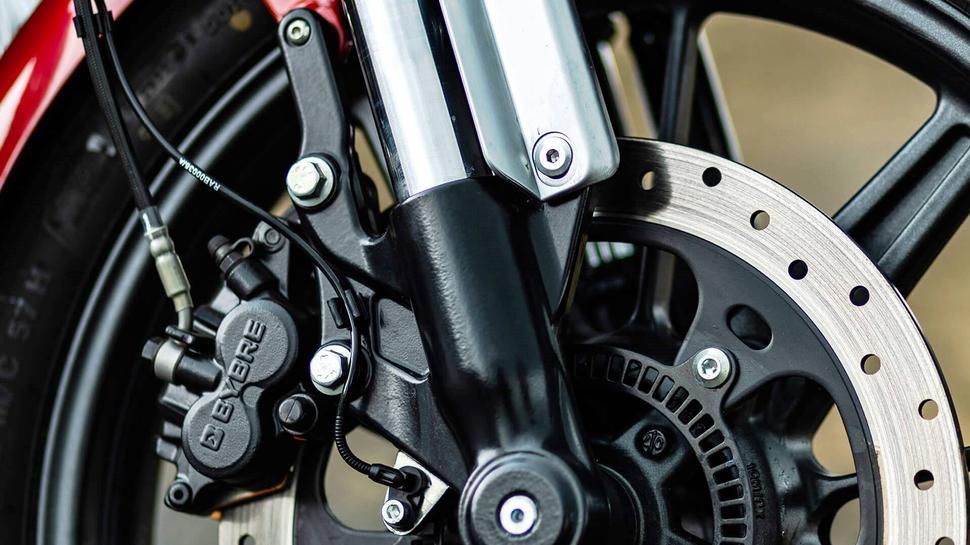 Что касается тормозной системы, то на каждом колесе Super Meteor стоит по одному двухпоршневому плавающему суппорту от Bybre, только спереди он установлен на 320-миллиметровом диске, а сзади - на 300-миллиметровом. Мотоцикл штатно оснащён двухканальной ABS.