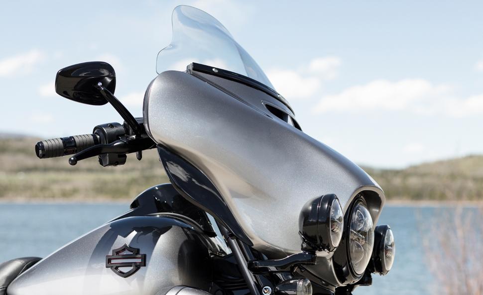 Ходовые огни и передние поворотники CVO Limited 2019 также выглядят классически, правда, без обычной для прежних лет поперечины, к которой они крепились раньше. Сейчас они закреплены к кожухам вилки. Единственная фара слегка утоплена в бэтвинг, а над фарой находится щель воздуховодаа, выход которого направлен непосредственно на райдера, чтобы слегка продувать воздушный карман, образуемый ветровиком, одновременно избавляя от слишком мощных завихрений в районе шлема. Продуманная мелочь для более приятной езды.