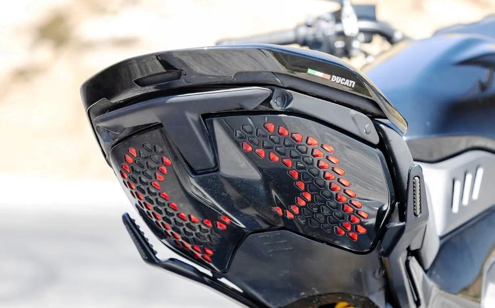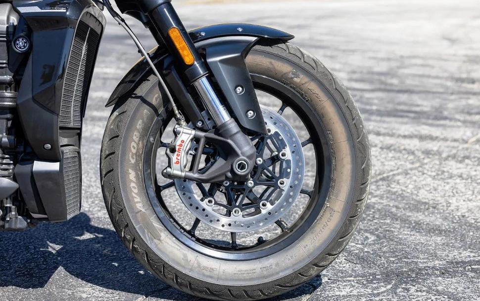 Ducati Diavel V4 оснащён подвесками с полным набором регулировок, но этот приятный факт несколько омрачён тем, что регулятор сжатия на амортизаторе спрятан настолько далеко и глубоко, что его хочется оставить в покое. В конечном итоге, тестовый Ducati Diavel V4 шёл жестковато, несмотря на некоторые регулировки. Тормоза тут - Brembo Stylema, как и на Triumph, только на итальянце спереди стоят 330-е диски. Само собой, больший диаметр дисков и меньший вес помогают Diavel быстрее сбрасывать скорость. Но информативность рычага переднего тормоза хороша у обоих мотоциклов. Что забавно (но неудивительно с учётом крутильного мотора), Diavel жрёт даже больше Triumph - по подсчётам получилось 7,8 литров на сотню. Но оно того стоит.