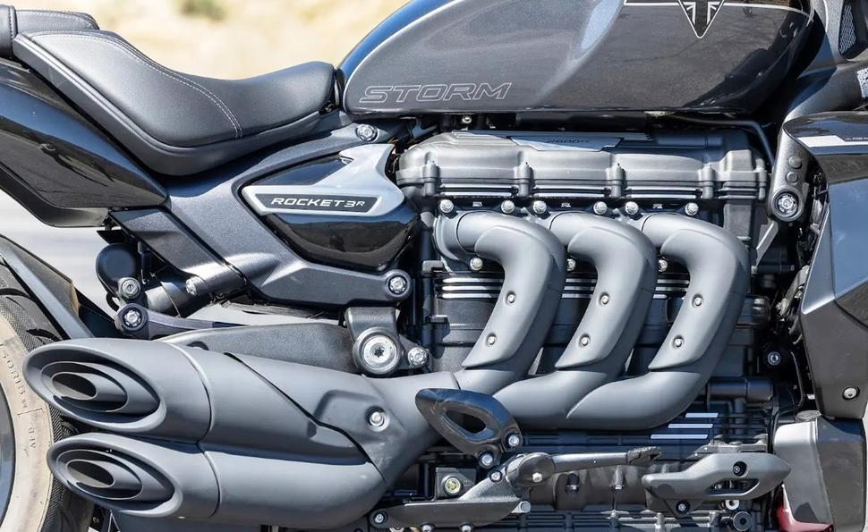 Triumph Rocket 3 Storm R даёт настолько другие ощущения от езды, что одно это выводит его из любых классов и жанров. Он один такой. И хотя каждый его аспект уникален, но главная жемчужина - это, конечно же, громадная рядная тройка. Управлять тремя поршнями размером со сковородку, аккуратно дозируя тягу чёткой рукояткой газа и посылая её через карданный вал на заднее колесо - это затягивает. Скользить по волнам тяги лучше плавно, а не агрессивно, хотя R порой явно подстрекает похулиганить. То, как он приподнимается на открытии газа благодаря рычажной подвеске и кардану, добавляет совершенно уникальные ощущения.