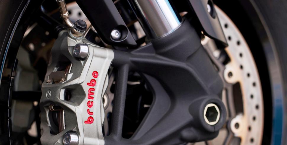 Мотоцикл такого размера и мощности нуждается в хороших тормозах, и Triumph не поскупились на весьма серьёзные Brembo M4.32 Stylema - четырёхпоршневые моноблочные суппорта на двух 320-х плавающих дисках спереди. Сзади стоит внушительный 300-миллиметровый диск с моноблочным четырёхпоршневым Brembo M4.32 - чем тяжелее мотоцикл, тем эффективнее на нём задний тормоз. Оптимизированная наклонная ABS штатно установлена на модели R и GT. Тормоза мощно и уверенно осаживают тяжёлый мотоцикл, но ещё важнее, что они идеально работают в горах, когда тормозить приходится часто и резко. Не было ни намёка на вскипание тормозной жидкости, ни малейшего повода для сомнений в их надёжности.