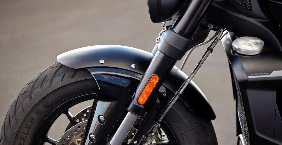 Storm выглядит и ощущается намного меньше, чем прошлые поколения Rocket 3. Заднее колесо всё ещё шириной 240мм, но на 16-дюймовом диске, а спереди стоит 150/80-17. Благодаря этому мотоцикл весьма неплохо рулится, и на ходу это очень заметно. Там, где более широкая передняя шина уже вызывает затруднения, типа кольцевых перекрёстков и крутых поворотов, новый Rocket 3 чувствует себя вполне уверенно. Несмотря на размер и вес, он ведёт себя вполне естественно в медленных поворотах. На более высоких скоростях о размерах колёс вообще не задумываешься - Rocket 3 идёт уверенно и устойчиво, легко проходит и быстрые затяжные повороты, и узкие извилистые участки горных дорог.