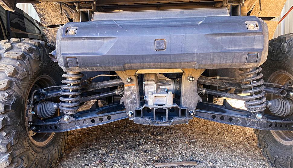 В Can Am Commander XT-P стоят очень похожие подвески на А-образных рычагах с ходами колёс по 35см и 2,5-дюймовыми амортизаторами Fox QS3. Колёсная база Can Am на 15см длиннее - 230см, и этот факт практически нивелирует состязание подвесок: более длинная база и более основательные амортизаторы позволяют Can Am отрабатывать большие неровности не хуже (а порой и лучше), чем Yamaha.