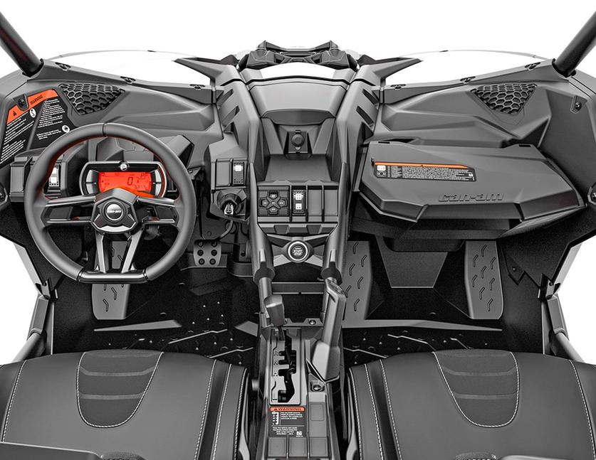 Что нам понравилось в кабине Polaris RZR Pro XP - так это большая информационно-мультимедийная система - цифровые приборы, Ride Command GPS, настройки подвесок и дополнительные обзорные камеры для гонок. А на приборной панели расположено множество закрытых и открытых отсеков для мелочей - от большого перчаточного ящика и до мелких закутков. X3 тоже оснащён большим перчаточным бардачком, и есть ещё небольшая полка между пассажирами, с которой всё падает прямо на пол. Ещё в RZR Pro XP намного тише.