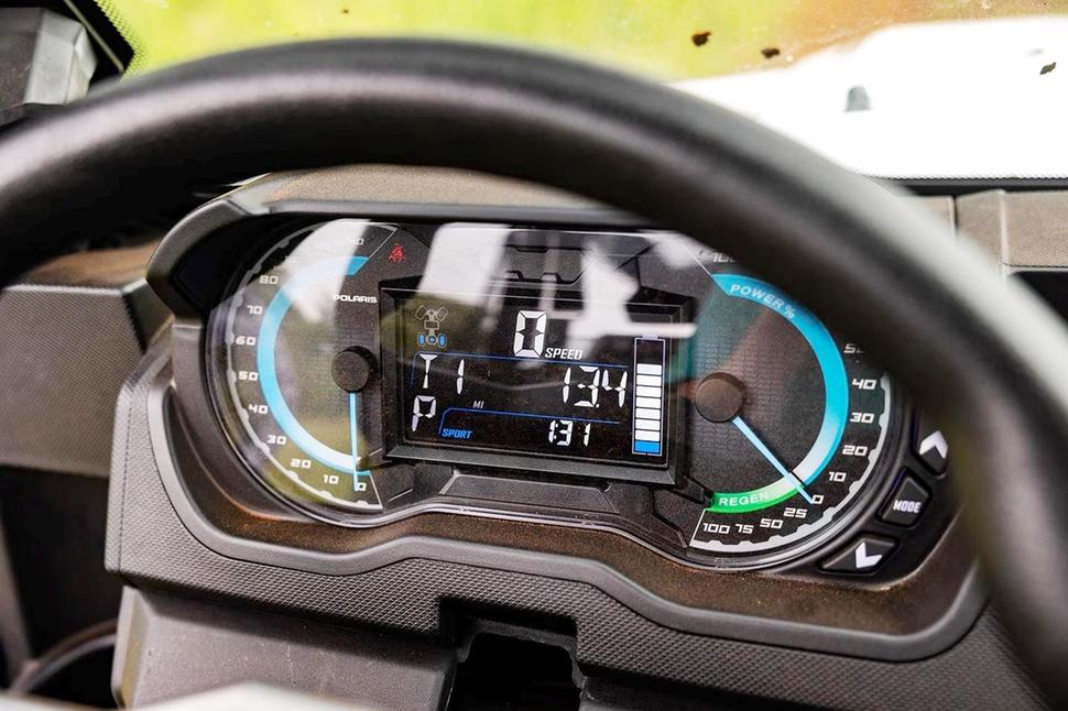 Кстати, про аккумулятор. Polaris выпускает два варианта Kinetic: базовый Ranger XP Kinetic Premium за 24999 долларов оснащён одной литиевой батареей ёмкостью 14,9кВт_ч, которой, по данным производителя, хватает примерно на 70км хода. Второй вариант, Ranger XP Kinetic Ultimate, оборудован уже двумя аккумуляторами суммарной ёмкостью 29,8кВт_ч, запас хода с которых вдвое выше, до 140км. Этот вариант обойдётся в 29999 долларов. Разумеется, как и в случае с бензиновым приводом, реальный запас хода зависит от водительских навыков и привычек. После тестовой трассы длиной 25км с четырьмя быстрыми перегонами компьютер показывал остаток запаса хода в 130км.