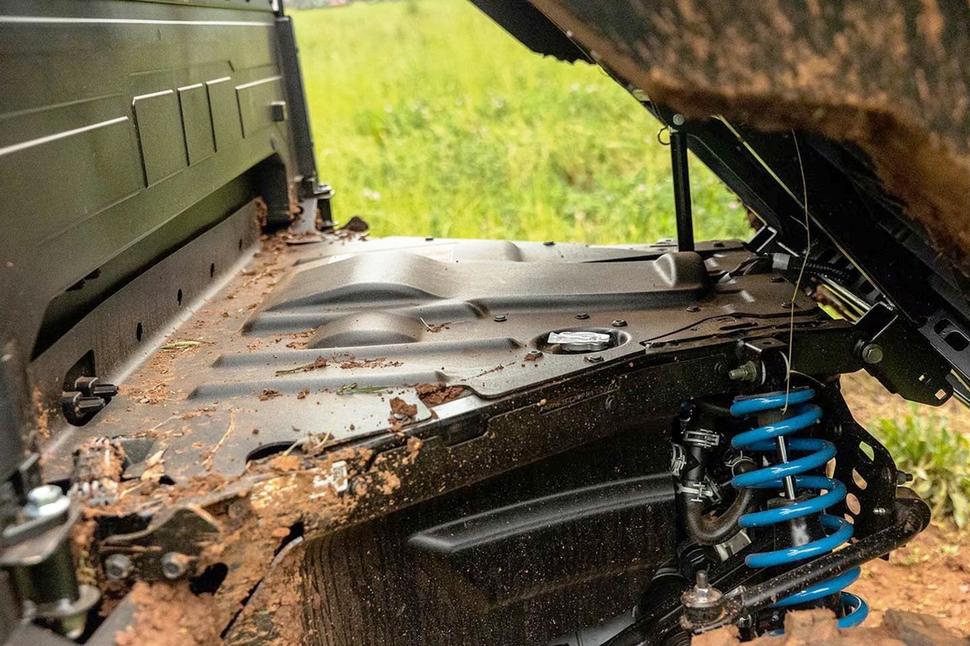 Для начала определимся с одним моментом: Kinetic - это полнофункциональный утилитарник серии Ranger. Большинство компонентов у него общие с бензиновым Ranger XP 1000, то есть те же 35см клиренса, 25см ходов подвесок спереди и сзади, 29-дюймовые шины. Он всё ещё способен бродить в воде по подножки. Но его мотор переменного тока на постоянных магнитах развивает внушительные 110лс и 190Нм тяги, то есть тот же XP 1000 с его 82 лошадьми превосходит весьма ощутимо. Это делает Ranger XP Kinetic самым мощным серийным утилитарным вездеходом на сегодняшний день, а попутно объясняет, почему электробагги оснастили кузовом грузоподъёмностью 567кг - на 113кг больше, чем у бензинового собрата. А вот нагрузочная способность при буксировке осталась идентичной - 1134кг.