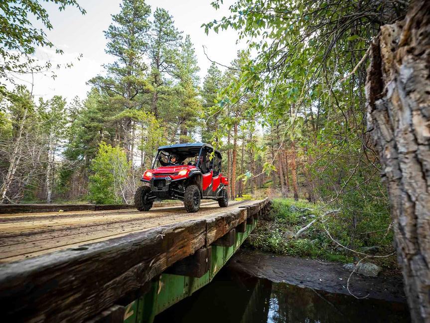 В остальном Honda Pioneer 1000-6 крайне похож на свою пятиместную версию. У него тот же двигатель, равно как и длинный шноркель спереди. Автоматическая шестиступенчатая коробка с двумя сцеплениями, представленная в этом году, имеет пониженную первую и заднюю передачи, а повышенная шестая использует более мощный двигатель для повышения максимальной скорости. Электроусилитель руля при работе учитывает скорость движения и помимо помощи в поворотах обеспечивает также возврат руля в среднее положение, дополнительно снижая усталость водителя. Ход передней подвески составляет 26,7см - на 2мм меньше, чем у пятиместной модели, а задняя имеет ход те же 25,4см. А самовыравнивающаяся задняя подвеска - отличная вещь для вездехода, способного возить одновременно грузы и людей на заднем ряду.