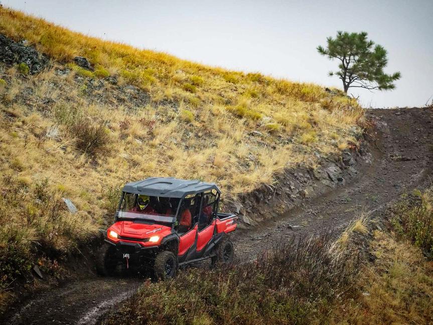 Но на ходу такие большие цифры не ощущаются. Перед выездом представитель Honda предупредил, что на маршруте будут места, где придётся поворачивать в несколько этапов, причём звучало это так торжественно, как будто речь идёт о каком-то суровом преодолении сложнейшего перевала. По факту поворот в три движения был ровно один, и то если знать трассу (или вездеход) немного лучше, то там вполне можно втиснуться за один раз. Учитывая, что Honda Pioneer 1000-6 был создан для опытных владельцев вездеходов - руководителей строительных бригад, фермеров, владельцев ранчо и просто любителей активного отдыха в большой компании - вряд ли у них возникнут проблемы с прохождением тесных поворотов.