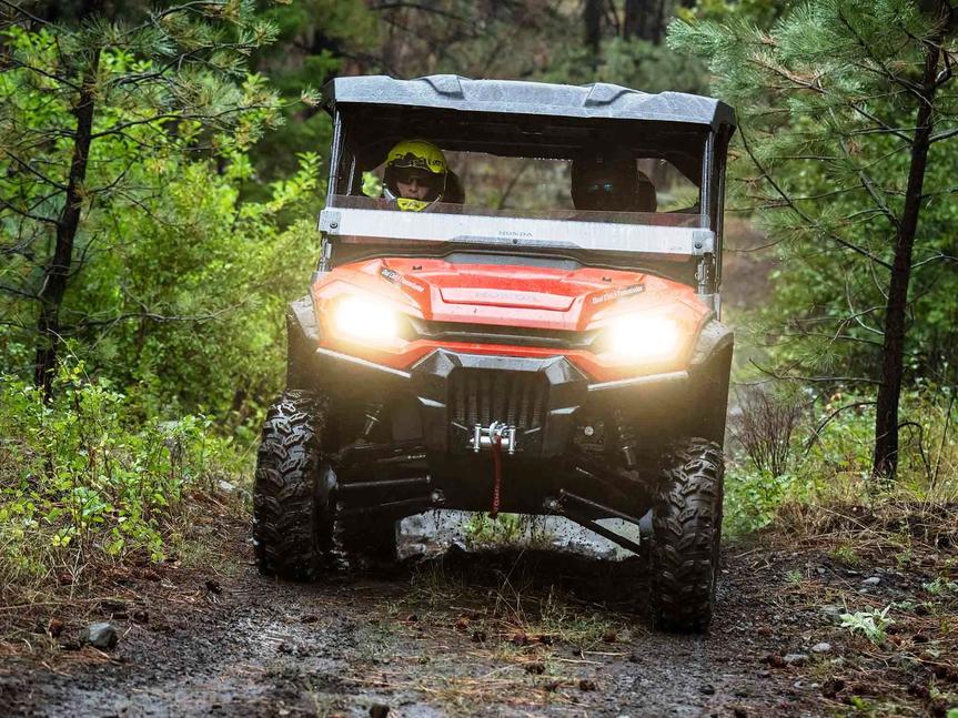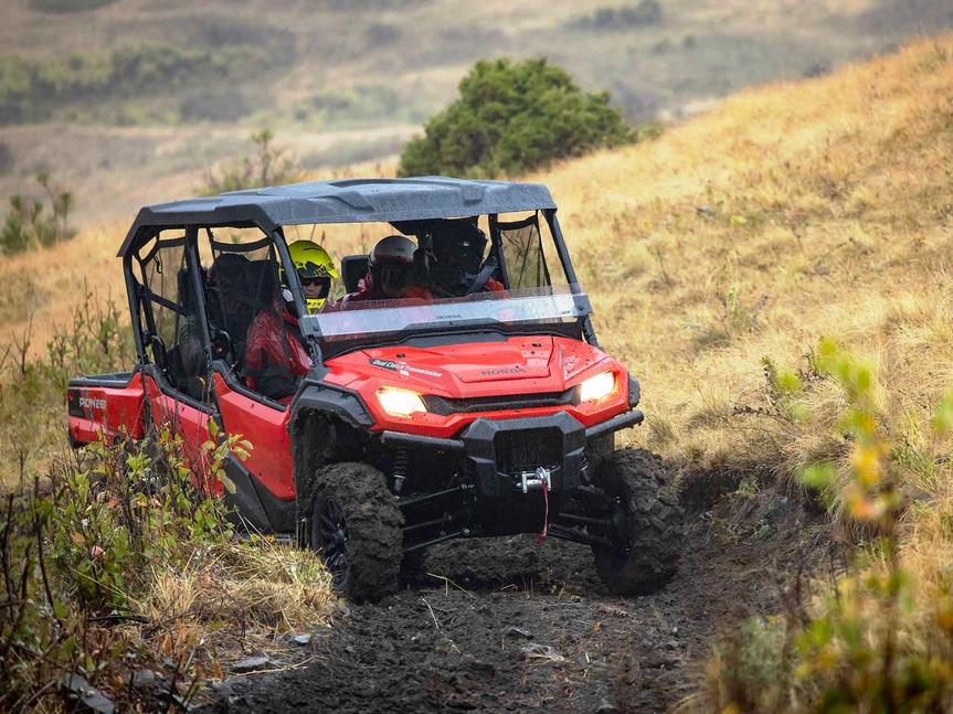 Honda Pioneer 1000-5 хвалят и ценят за то, что он охотно служит рабочей лошадкой по будням и рад повеселиться по выходным. Здесь всё то же самое, только лучше: Honda Pioneer 1000-6 легко лазает по грязным холмам, газ и торможение двигателем очень хорошо и точно дозируется, а дополнительные 98кг по сравнению с пятиместной моделью (язык не поворачивается назвать её коротышом, но по факту так и есть) совершенно не ощущаются. Более отзывчивая система умного полного привода и блокировка дифференциала подключаются моментально, а активация переднего дифференциала не вынуждает искать для разворота площадку размером со стадион. И ещё стоит признать, что Honda всё-таки умеет делать роботизированные трансмиссии: вариатор, конечно, работает исключительно плавно и устраняет потенциальные рывки при переключении, но более высокий КПД, более точное управление оборотами и надёжное торможение двигателем хондовского робота заслуживают всяческих похвал. С этой трансмиссией реально чувствуешь двигатель, и это особенно полезно в сложных условиях езды.
