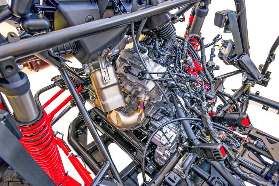 Honda Talon 1000X-4 - это единственные спортивные четырёхместные вездеходы от крупного производителя без ремня. 1000-кубовая рядная двойка с одним верхним распредвалом передаёт тягу через шестиступенчатую трансмиссию с двойным автоматическим сцеплением. Прелесть этой конфигурации в том, что трансмиссия может работать как в автоматическом (мало чем отличающемся от езды с вариатором), так и в ручном режиме (переключаясь лепестками на рулевой колонке). В любом случае при езде возникает привычное и приятное чувство переключения передач, а вот опасаться обрыва ремня тут совершенно точно не стоит. Более того, для карабканья по скалам Talon имеет дополнительную пониженную, то есть все шесть его передач переводятся в пониженный режим. Конечно, это не идеальный вездеход для лазанья по камням, особенно на больших колёсах. Но что касается препятствий на обычных трассах, то Talon способен перелезть через любое из них.