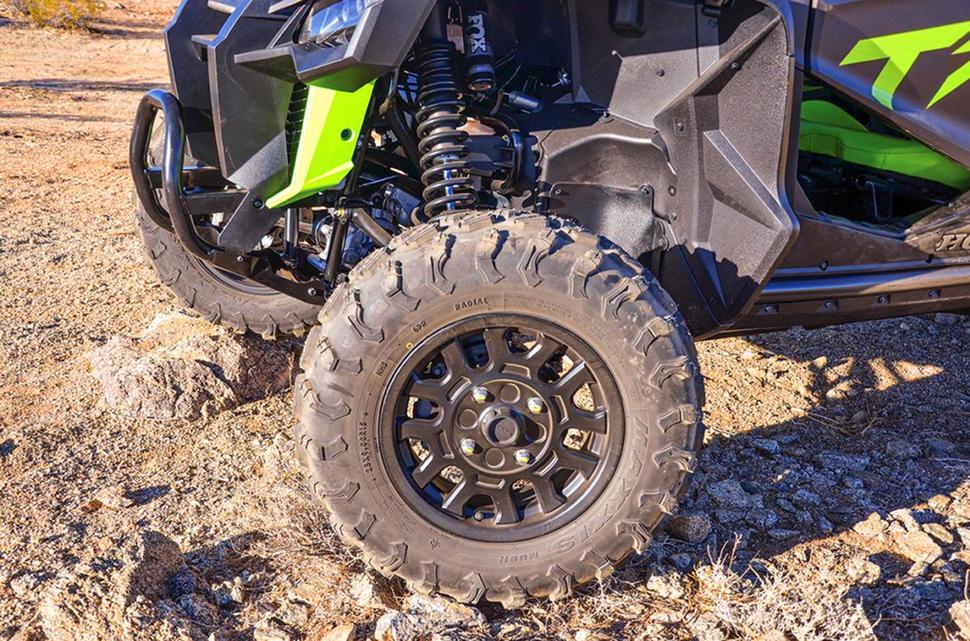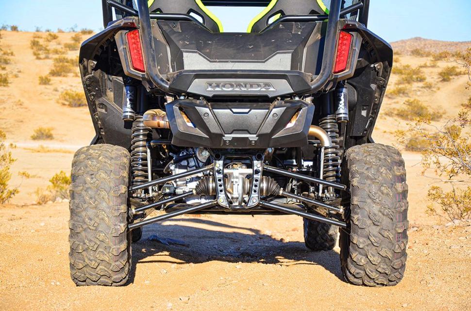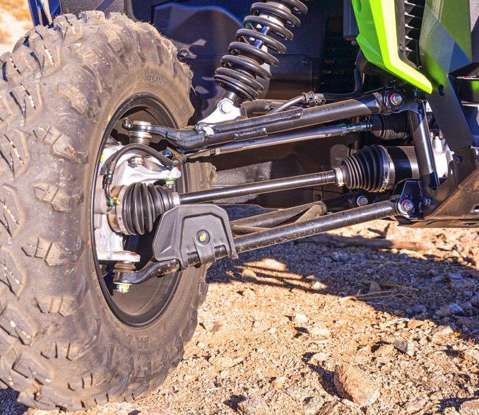 Базовая версия Honda Talon 1000X-4 2021 оснащена амортизаторами Fox QS3 с простой и удобной регулировкой. Они обеспечивают передней подвеске на двойных А-образных рычагах ходы в 37см. Задняя подвеска на тройных продольных рычагах имеет ход в 38см. Конечно, базовой версии недостаёт длинноходных регулируемых подвесок Talon R, но и имеющиеся амортизаторы обеспечивают отличную поддержку и сглаживают ходы подвесок практически без перегрева и снижения амортизирующих качеств, по крайней мере при обычном, не безумном темпе езды по грунту. Для того, чтобы, как говорится, “серьёзно поднавалить”, лучше взять версию Live Valve - пассажиры оценят, потому что она идёт плавнее и на малом ходу, и быстро. И кстати, имейте в виду, что существуют афтермаркетные комплекты длинноходных подвесок для Talon X, причём даже нескольких производителей.