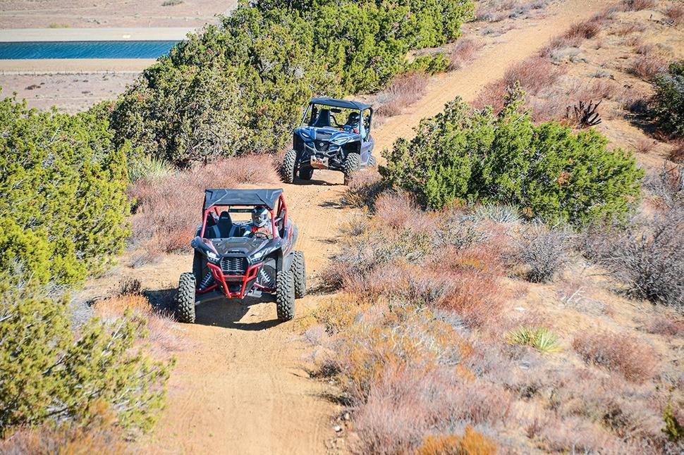 Двигатели обеих моделей весьма похожи: двухцилиндровые атмосферные 999-кубовые рядники, рассчитанные на долгую работу, в связи с чем обе модели довольно тяжёлые. Максимальная скорость на обоих багги ограничена 110км/ч, но Yamaha до максималки добирается на пару секунд быстрее. Режимы отклика D-mode ощутимо влияют на характер мотора и могут здорово украсить скучную поездку где-нибудь по простой местности. На Kawasaki режим пониженной мощности особо не нужен, KRX и без него довольно спокойный, разве что для обучения внедорожной езде может пригодиться. Ну а если нужно посадить за руль Yamaha новичка (или, скажем, наёмного работника, или на тест-драйве), можно ограничить скорость до 56км/ч ключом "Turtle" под капотом - такая фишка была бы полезна для любого вездехода.