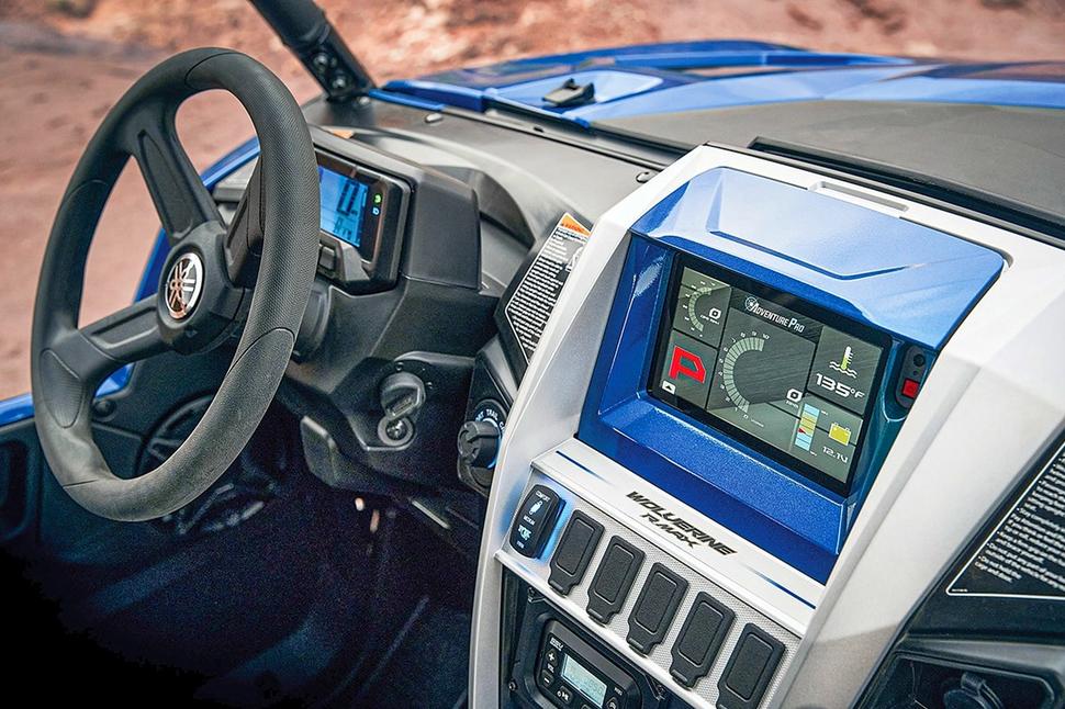 Версии eS и LE - самые нафаршированные, и особенно это касается кабины и приборной панели. Например, впервые на модели Teryx KRX 1000 Kawasaki установили позади руля ЖК-экран, на котором отображаются разные интересные подробности типа скорости и трип-метра, режим подвесок, температура ремня, а также максимальная и средняя скорость. Ну а в Yamaha Wolverine RMAX2 экран на панели представляет собой полноценный GPS-навигатор под названием Adventure Pro, и о нём можно написать отдельную статью. Здесь и счётчик времени круга, и карта пройденного маршрута, и доступ к архиву чужих маршрутов на случай, если не хочется ехать куда глаза глядят. А ещё этот навигатор снимается с приборной панели, например для обновления прошивки или чтобы слить с него данные и построить новый маршрут на следующий день. Это, наверное, самый многофункциональный навигатор из всех бортовых устройств на сегодняшних багги. А вот чего нет ни в одной из этих моделей, так это камеры заднего вида. Причём экран в Teryx KRX ES имеет возможность подключения камер, и Kawasaki предлагает их как опцию, с установкой на передний и задний бампера.