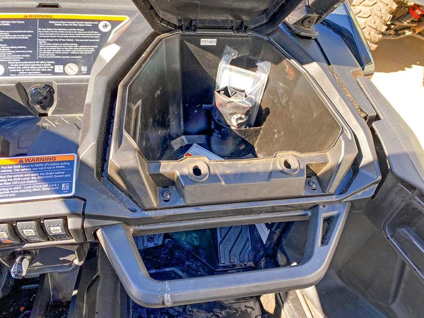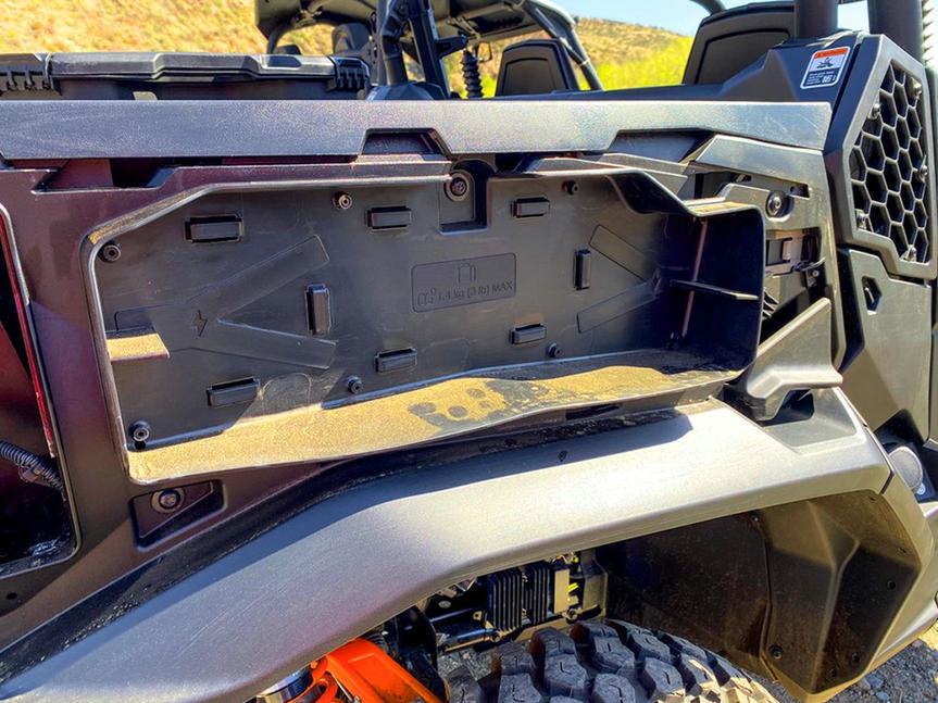 Ногам в кабине просторно, а сиденья мягкие. Они низкие, а откидной кузов высокий, так что он несколько перекрывает обзор назад. С другой стороны, Can-Am Commander оснащён зеркалом заднего вида. А вот что касается простора как такового, тут комфорт принесён в жертву компактности: если вы хоть чуть-чуть больше худенького подростка, вы будете постоянно соприкасаться с соседом по кабине плечами. Никакой центральной консоли или полочки, разделяющей водителя и пассажира, в кабине не предусмотрено. Правда, есть два довольно удобных бардачка (которые перчаточные ящики), но в остальном на передней панели мало места не только для аксессуаров, но даже для переключателей