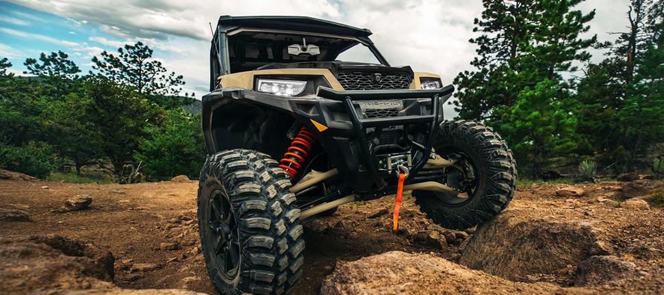 Абсолютно комфортные для обычной езды - от повседневной до активной - благодаря большим шинам и длинноходным подвескам Deluxe существенно комфортнее, чем General без XP. Подвески справляются и с агрессивной ездой, и на неровной местности можно держать довольно высокий темп, недоступный большинству утилитарных или рекреационных вездеходов. К слову, сглаживание сжатия на амортизаторах Walker Evans Velocity регулируется без инструментов.