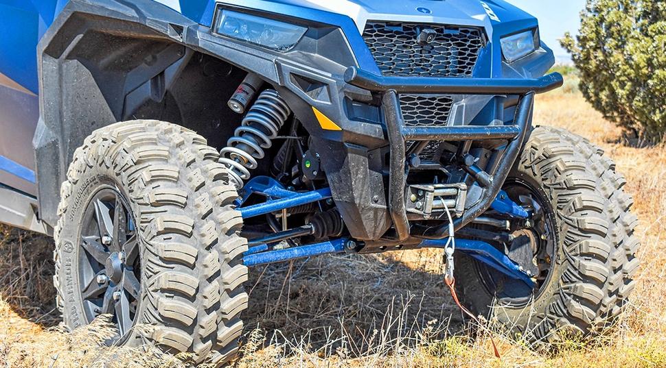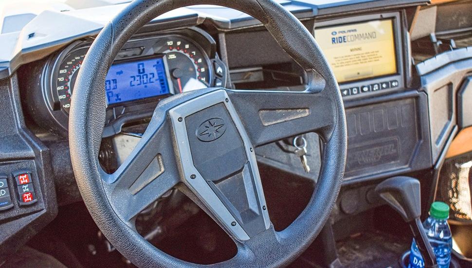 Polaris General XP 4 1000 Deluxe настолько бодро рулится, что о длинной и широкой базе и четырёх сиденьях практически не вспоминаешь - и это на фоне уверенного, надёжного зацепа в поворотах и на неровной местности. Благодаря 115-дюймовой (292см) колёсной базе он весьма устойчив при быстрой езде по открытой местности, но при этом он, конечно, не настолько компактный и шустрый на гребёнке, как RZR XP 1000 с его 90-дюймовой базой. На сложной местности его мощный двигатель легко вытягивает вездеход из затычных мест, затаскивает на высокие холмы и справляется с глубокой грязью. Высокий клиренс, податливые подвески, эффективная система полного привода и широкая колея позволяют этому вездеходу легко справляться с любыми испытаниями на сложных трассах. Отличный обзор благодаря высокой посадке и короткому скошенному капоту позволяет легко ориентироваться на камнях, а конструкция кузова обеспечивает лучшую грязезащиту, чем у спортивных багги.