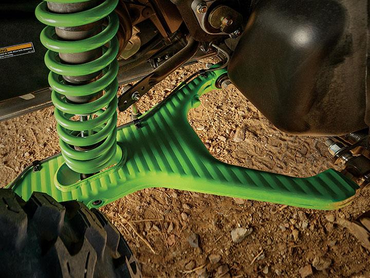 Шасси и подвеска Honda Talon 1000R 2019 отличаются от 1000X тем, что задняя подвеска R имеет четырёхрычажную продольную конструкцию. Неровности рельефа сглаживают амортизаторы Fox Podium 2.5 QS3 на всех четырёх колёсах, при этом ход задней подвески составляет 51 см. Инженеры Honda создали четырёхрычажную систему для улучшенного контроля геометрии задней оси при больших ходах подвески. Угол схождения колёс при полном ходе амортизатора меняется всего на 0,3 градуса. Инженеры Honda создавали вездеход Talon чрезвычайно устойчивым: такая конструкция позволяет сохранять полный контроль над задней частью аппарата при полной нагрузке на подвеску на высоких скоростях. Передняя подвеска на двойных поперечных рычагах имеет ход в 45 см. Интересно, что ширина Talon 1000R составляет 173 см или 68,4 дюйма - не круглое число ни в одной системе измерений, т.е. инженеры Honda даже не пытались втиснуть свой аппарат в рамки какой-то категории или класса. Стоит также упомянуть тормозную систему Talon - все 4 колеса оснащены суппортами на 250-х дисках и системой электронного распределения тормозного усилия, оптимально активирующую каждый из суппортов для максимально эффективного торможения. Отметим также клиренс в 33 см и багажник грузоподъёмностью 135 кг.