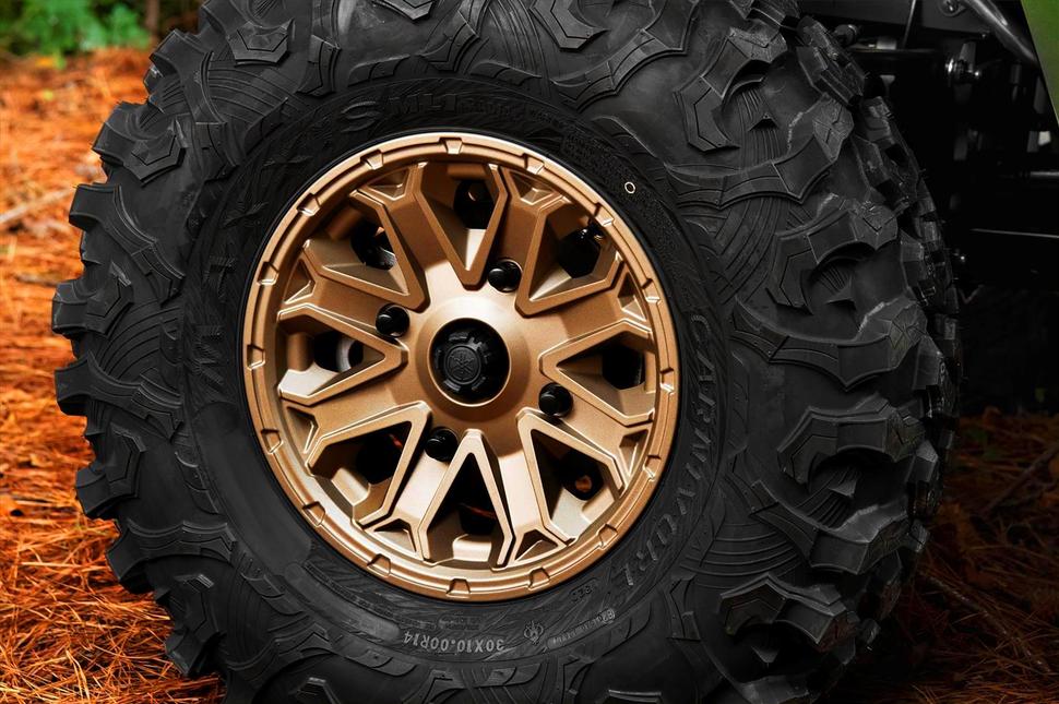 Колёсная база в 220см обеспечивает отличный контакт на крутых склонах, а клиренс RMAX2 имеет максимальный в своём классе - 35см. Радиальные шины 30x10-14” на алюминиевых дисках обеспечивают "квадратную" конфигурацию, которую мы предпочитаем.