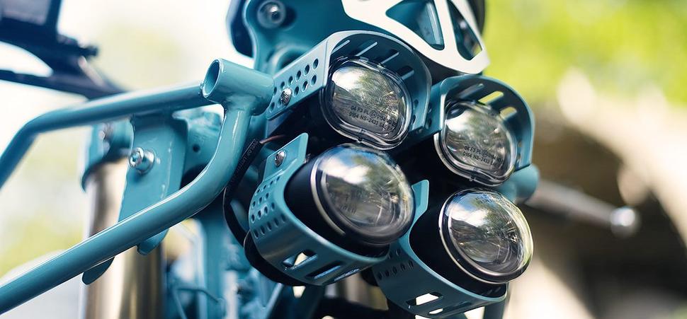 Royal Enfield Himalayan - индус до мозга костей. Во-первых, сам бренд сегодня принадлежит Индии. А во-вторых, Гималаи - колоссальная горная система, которая расположена в том числе на территории Индии. Разумеется, это не могло не сказаться на его конструкции, причём в самом хорошем смысле: RE Himalayan имеет очень своеобразное крепление фары, которое скорее напоминает багажные рамки. Да собственно так и есть - индусы, любители навьючивать, крепят на морду своих мотоциклов всё что угодно, и рамки Himalayan в этом деле очень пригождаются. Эти характерные рамки команда не только сохранила, но и подчеркнула - установив между ними футуристичный кластер из четырёх диодных фар, над которым приладила решёточку обтекателя от RE Continental GT - просто уже из любви к постап-эстетике.
