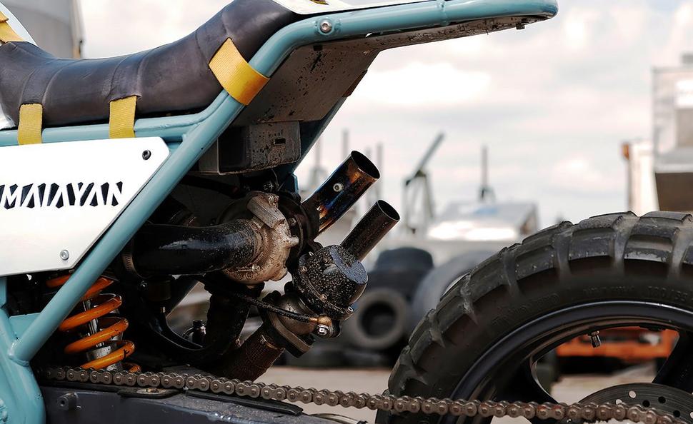Несколько перебор для 411-кубовой одностволки на маленьком турэндуро? Ну так в том и цель Custom Crew: вдохновившись самыми жуткими мотоциклами из Mad Max и японских мультиков, команда придумала сделать мотоцикл в стиле "постап-панк" - и этот стиль неожиданно пришёлся к лицу Himalayan.