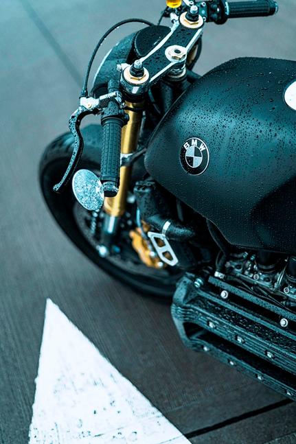 С двигателем Мэтт сотворил чудо - большой четырёхцилиндровый движок BMW K100 выглядит здесь органичным элементом красивого байка, а не уродливой глыбой металла. Весь чёрный, воздухозаборник переделан под кастомный манифольд и небольшой капсульный фильтр, выпускные патрубки остались на месте для того, чтоб были счастливы сотрудники, выдающие талон техосмотра, а кастомный глушитель с хромовым наконечником, выходящий набок, даёт и вид, и звук! Перед сборкой была перебрана проводка, и из неё удалены скрутки и прочие безобразия.