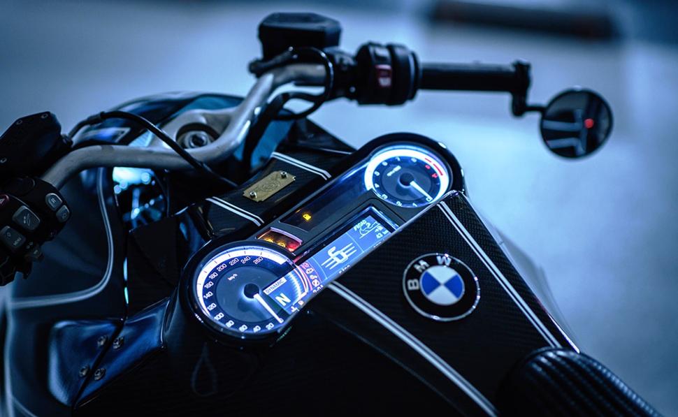 Новая диодная фара мотоцикла интегрирована в передний обтекатель, позади которого находится кастомный руль, крепящийся прямо к оси рулевой колонки. Ещё дальше встроена штатная приборная панель, а кнопка бесключевого запуска двигателя теперь находится на левой стороне мотоцикла. Ещё дальше находится фирменная круглая эмблема BMW, а следом за ней - узкое рубчатое сиденье с небольшим упором сзади, изготовленное Skunk.