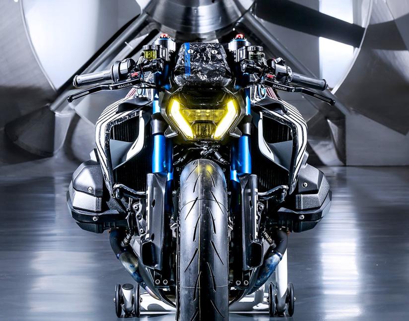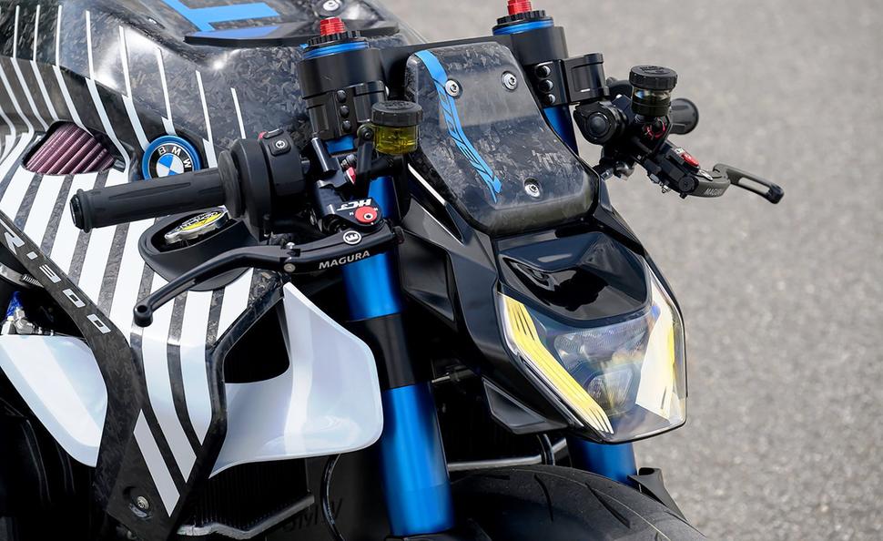 BMW R 1300 R сохранил штатную фару, в которую установили жёлтые диодные ДХО от BMW M4 CSL. Небольшой штампованный карбоновый обтекатель над ней закрывает то место, где раньше стояла приборная панель. Регулируемые клипоны по бокам от него оснащены мастер-цилиндрами от Magura.