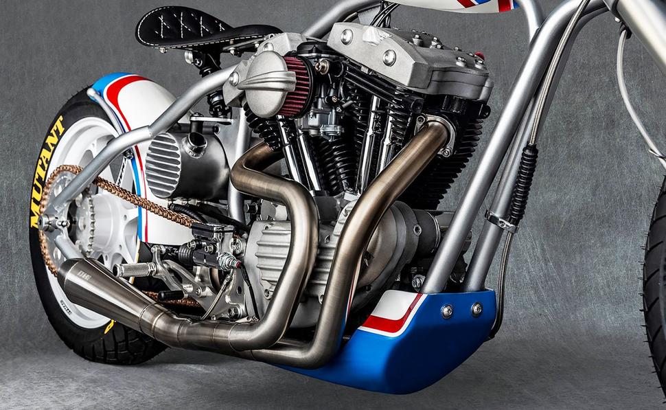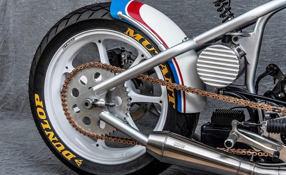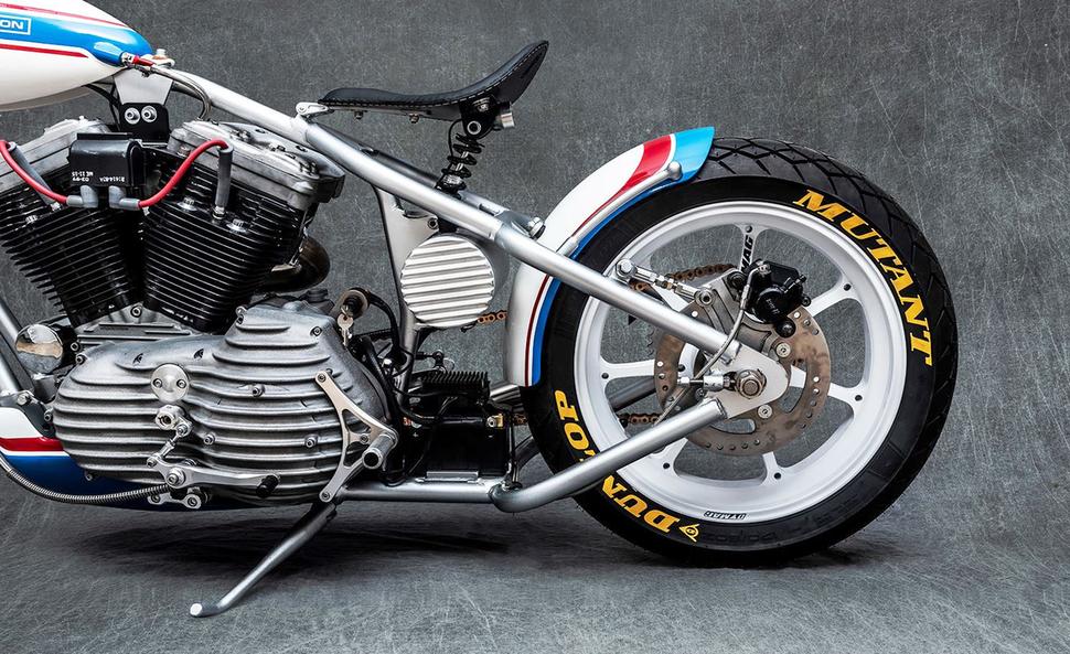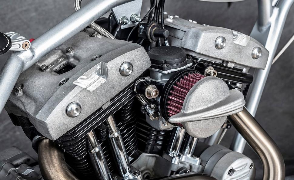 Двигатель неплохо работал, хоть и выглядел так, будто его достали из болота. Корбан перебрал головки, заменил изношенное сцепление и установил программируемое зажигание DynaTek 2000i. Затем установил новый карбюратор CV40, воздушный фильтр TC Bros и нержавеющий выхлоп 2-в-1 от Cone Engineering. Затем мотор был перекрашен и оснащён оребрёнными крышками от французов EMD. Оребрение продолжается и на других частях мотоцикла, например, на маслобаке от Lowbrow Customs, аккуратно притулившемся в заднем треугольнике рамы. Прямо над ним расположено стильное кожаное седло от Alex Leathercraft из Германии.