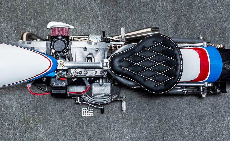 За обтекателем находятся клипоны, которые Корбан изготовил, выточив круглый алюминиевый шток и установив его в обычные покупные зажимы. Винтажного вида органы управления изготовлены Moto Iron, а грипсы - Biltwell Inc. При внимательном взгляде на ножные рычаги можно разглядеть компоненты от Sato Racing.
