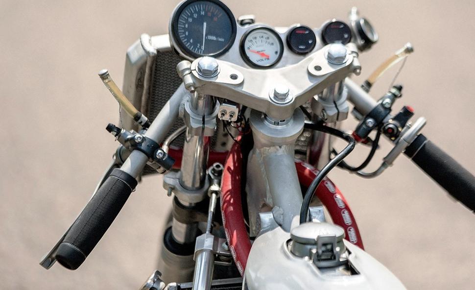 Руль голый, с тахометром, вольтметром и термометром от AutoMeter и Koso. Спереди кастомных клипонов, оснащённых пультами от местных спецов KTC, находится сетчатый обтекатель, перекликающийся внешним видом с большим радиатором позади переднего колеса.