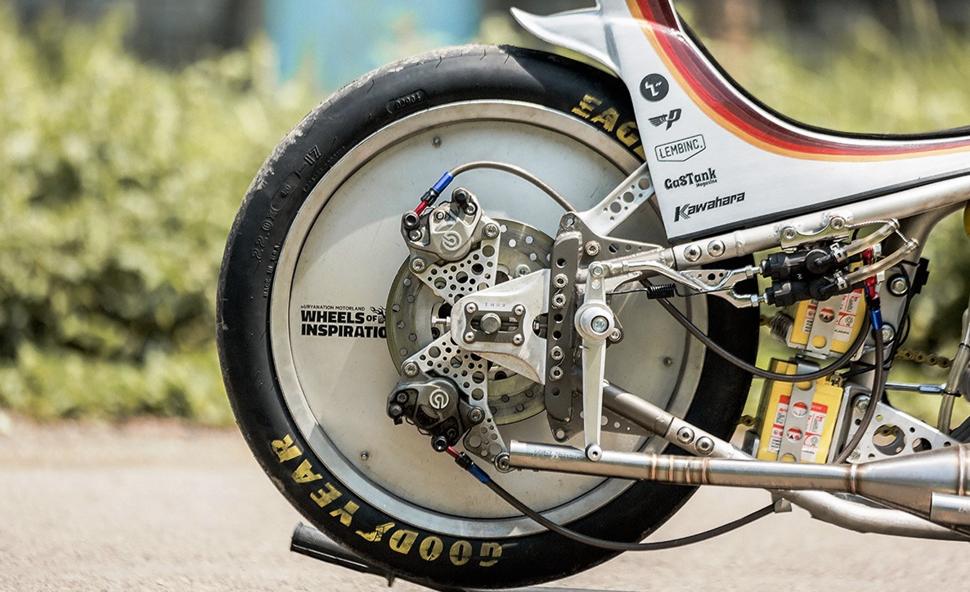 Строить олдскул - это сложный путь. Thrive использовали верхнюю траверсу от Suzuki RGR 150, ещё одной местной модели, и установили в неё вилку Kawasaki, укороченную на 100 мм. 17-дюймовые колёса обуты в Goodyear Eagle, и на заднем установлена алюминиевая сплошная заглушка.