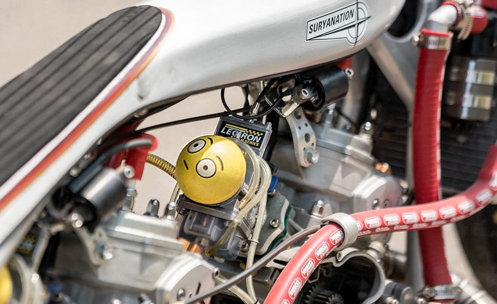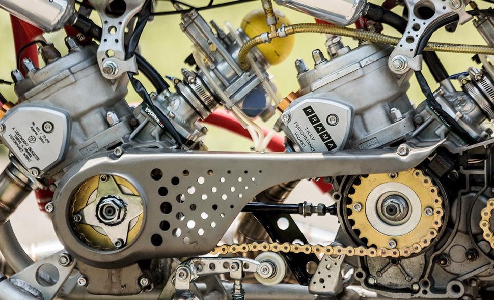 Йозеф благополучно создал крайне необычную сцепку из двух двигателей, сильно переделав зажигание, расточив каналы, установив 270-градусные гоночные коленвалы, облегчённый маховик и квикшифтер. "И кое-что ещё, о чём мы вам не расскажем!", - хитро улыбается Путра.