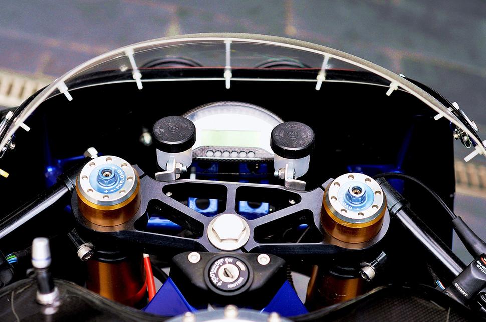 Подвески - тоже топчик: кастомная вилка Ohlins, изначально предназначенная для 1098-го Ducati, установлена во фрезерованных на ЧПУ траверсах S&P с их же изготовления клипонами. Они обуты в грипсы Domino с короткоходной ручкой газа, а пульты были доработаны для совместимости с диодными фарами и поворотниками от Koso, а также для управления цифровой приборкой Aviacompositi. Она обладает всем штатным функционалом, а заодно поддерживает таймер круга, индикатор момента переключения и другие гоночные фишки.